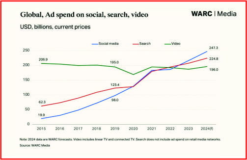 Las redes sociales son un potentísimo imán atrayendo los presupuestos publicitarios de los anunciantes. De acuerdo con el informe «Global Ad Spend Forecast» de WARC, esta categoría alcanzará niveles de inversión particularmente conspicuos en 2024 y adelantará, de hecho, a «search» como el canal con más volumen de inversión publicitaria en todo el mundo.